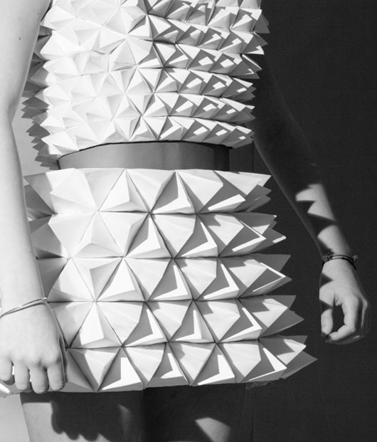 This Pyramidal Dress is made entirely of handmade paper pyramids. It’s the work of Alexis Facca a.k.a Paper Donut. You can find more images here.