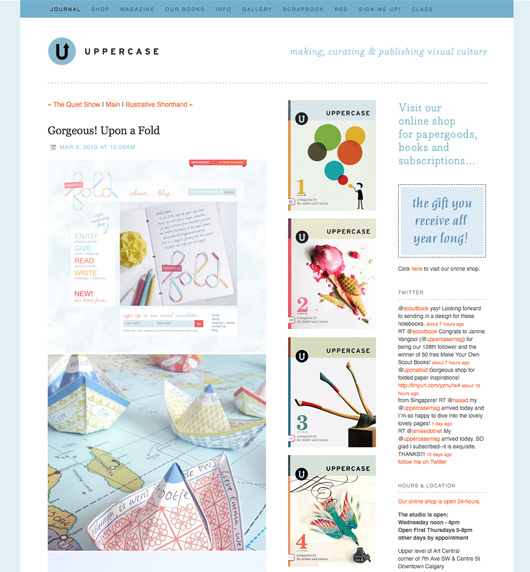 UPPERCASE (http://www.uppercasegallery.ca/) is a magazine for the creative and curious. I have LOVED this magazine since issue 1! It’s a quarterly magazine printed on very lovely paper and you can get it from the extremely awesome magnation. (http://www.magnation.com/Uppercase-2771.php) So anyway, I was scrolling through my very long list of unread feeds – 987 to be exact, and found this (see below)! Word is really traveling fast and I’m finding it all VERY exciting!