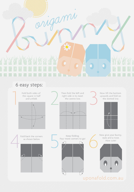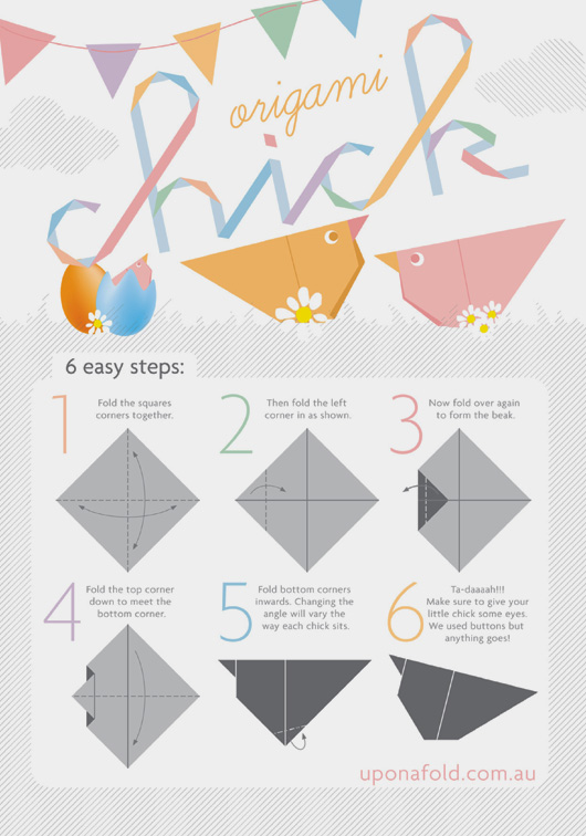 So, it’s Upon a Fold’s first Easter and to celebrate we have designed two easy instruction sheets for you to download and make your very own cute chicks and bunnies! And as a little extra treat for our customers, we’ll be giving away 3 sheets (A5 size) of beautiful Japanese paper with every order placed before April 6, 2010!
