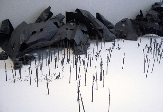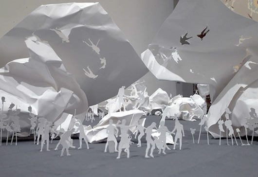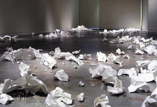 With the exhibition Slash: Paper Under the Knife (http://collections.madmuseum.org/html/exhibitions/485.html) coming to an end today, I thought I might take a closer look at some of the exhibiting artists, starting with native New Yorker, Andrew Scott Ross. (http://andrewscottross.com/home.html) Here are a few of his intricate cuts and crumpled paper pieces. Above: *Stones and Rocks and Stones and Bones*, 2009. Detail of installation at the Museum of Arts and Design (http://www.madmuseum.org/) (MAD).