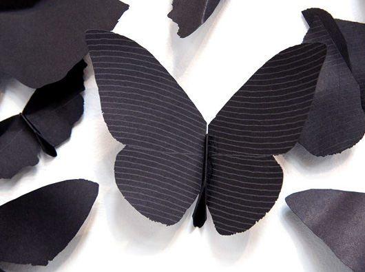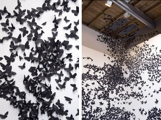 So here are the 25,000 cut-paper moths I promised to show you. Yes I know, they are amazing! This installation is the work of Mexican artist, Carlos Amorales, (http://www.yvon-lambert.com/carlos_amorales-A1.html) one of the exhibiting artists in Slash: Paper Under the Knife. (http://collections.madmuseum.org/html/exhibitions/485.html) This work titled *Black Cloud* was created by sticking 25,000 black paper moths on the walls, ceiling, beams, corridors and even bathrooms of the exhibition space and studio. Talk about an invasion! Above: *Black Cloud* (Installation view), 2007.