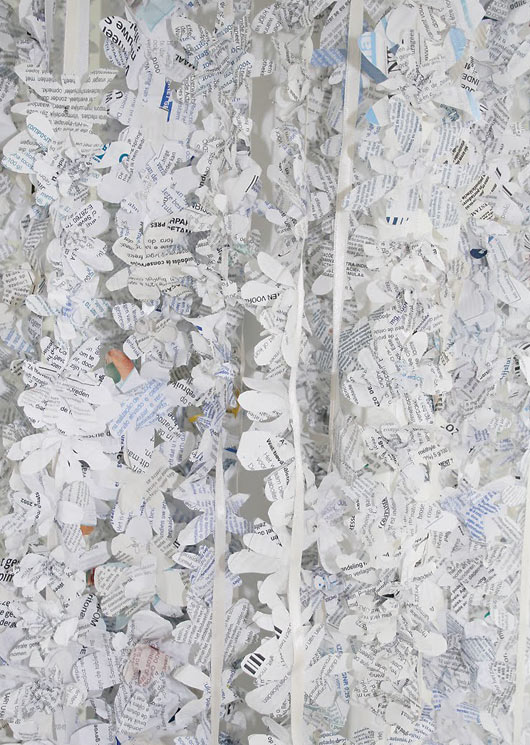 [Celio Braga](http://www.celiobraga.net/) originally created this installation for Slash: Paper Under the Knife. (http://collections.madmuseum.org/html/exhibitions/485.html) It was titled Placebos (http://bit.ly/9d0QyI) and comprised of thousands of small delicate paper flowers made from the printed material found in prescription drug packaging. The flowers were hung as a series of memorial wreaths. Included in the work was a wall of linked paper chains that were later to be exhibited at Teto, (http://www.tetoprojects.com/search/label/Celio%20Braga) a project gallery in Amsterdam and the space where the images pictured here have been photographed. Above: *Unveil* (Installation view), 2009.