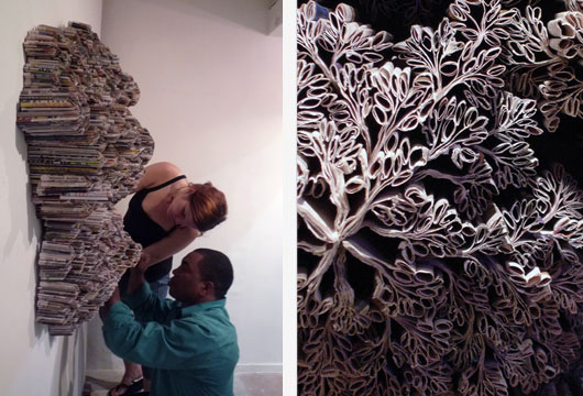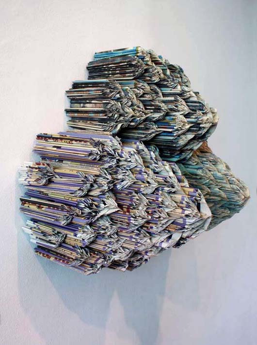 I came across Jaime Bennati‘s work just recently and fell head over heels with this particular one made of paper (of course)! The idea came to her when she discovered a huge stack of old newsprint in an abandoned building one day (that has since been torn down) and decided to take it to use as the main medium for her art.
