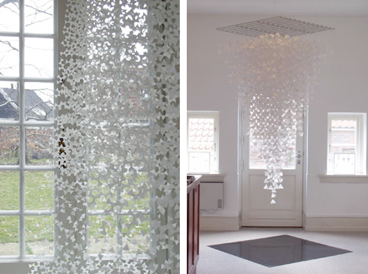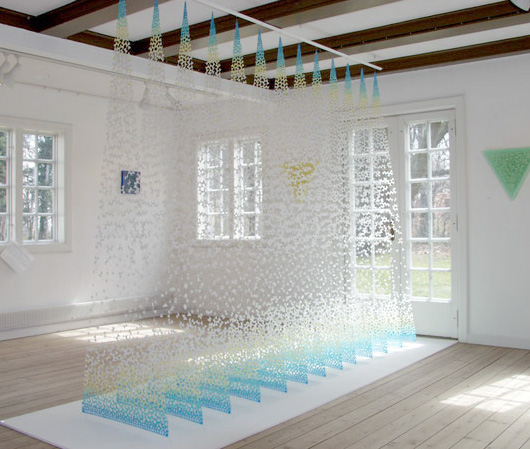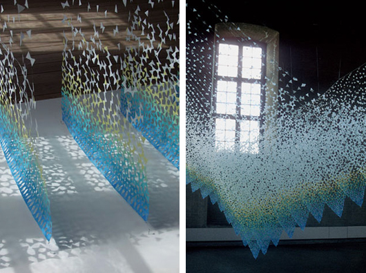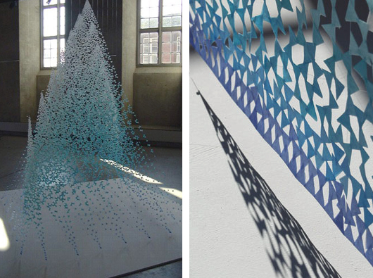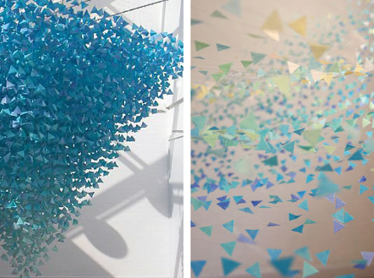 Yuko cuts up small triangular pieces of tracing paper that she says, symbolises a molecule of water, light or air. She is drawn towards pointillism and finds inspiration from this technique when creating these truly ethereal paper installations.