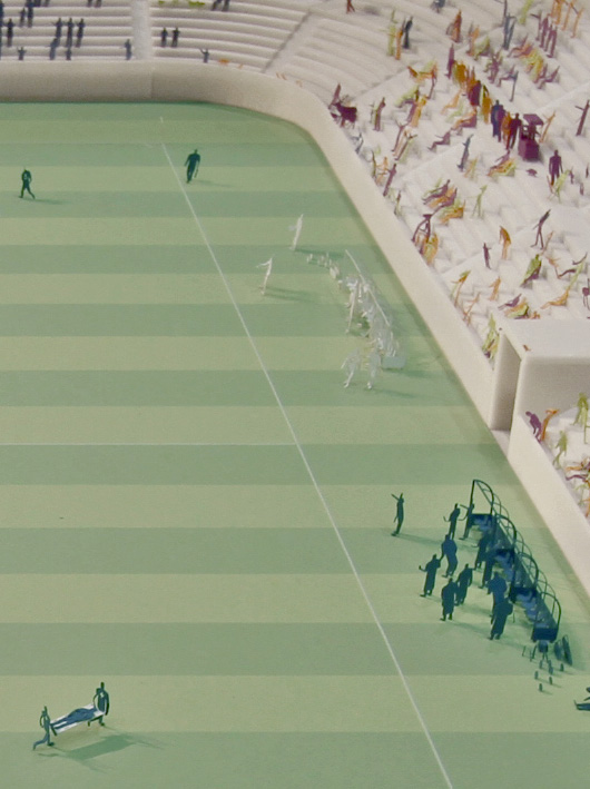 The stadium is filled with little paper people. They are part of the 1/100 Architectural Model Accessories Series designed by Naoki Terada and this particular set is titled No.7 Football. The set includes 11 players plus reserves, a team manager, doctor, two referees, a goal and corner flag, whistle, yellow card, red card, ball, bench, drinking bottle, stretcher, first aid kit, scarf, ball bag and even a lost dog. Geez, Naoki has really thought of everything here!