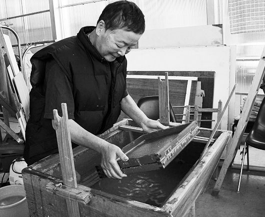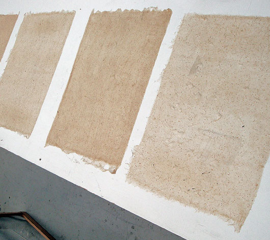 After a stack of new paper has drained, each damp sheet is individually peeled off and brushed smooth onto a flat surface to fully dry. It is sometimes then polished with a dark green camellia leaf.