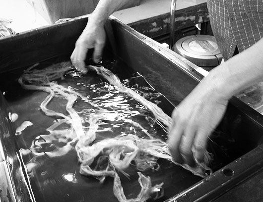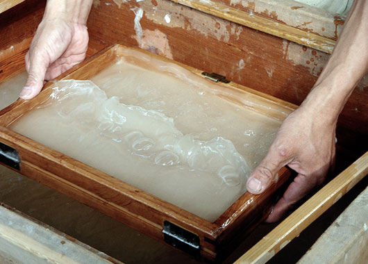 After the bark has been beaten to a pulp, it is put into water and further broken down and mixed. With Kozo, the thickening agent is slowly added. Paper makers can often tell when paper is ready to be formed, by the sound of the water.