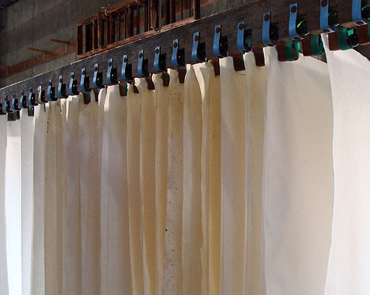 Larger sheets of paper are hung up to dry in addition to being laid out on boards.