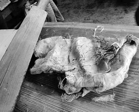 The inner bark is then soaked and any impurities are removed by hand. With Kozo fiber, a thickening agent of Tororoai (hibiscus root) is also prepared and strained. Pictured is master paper maker Tamura Tadashi.