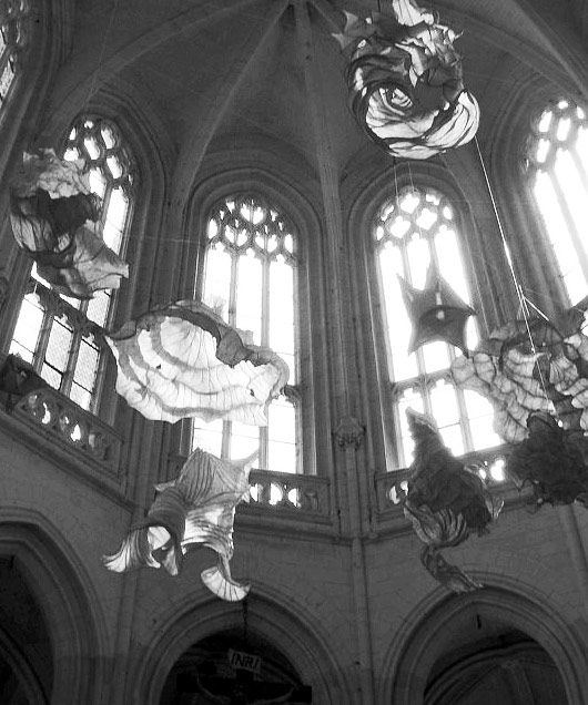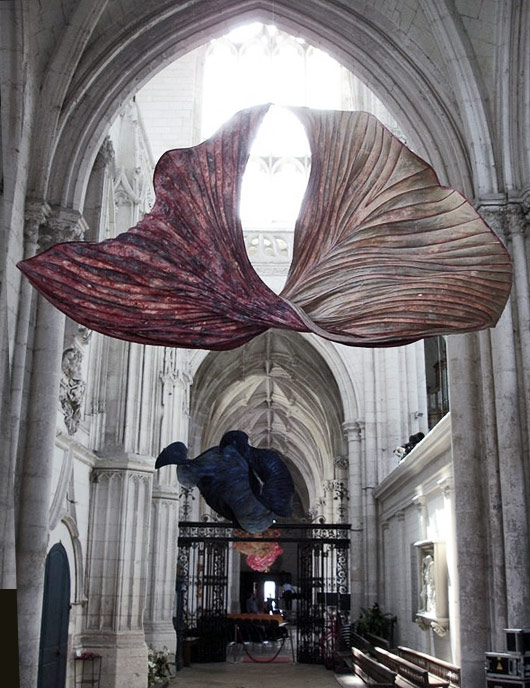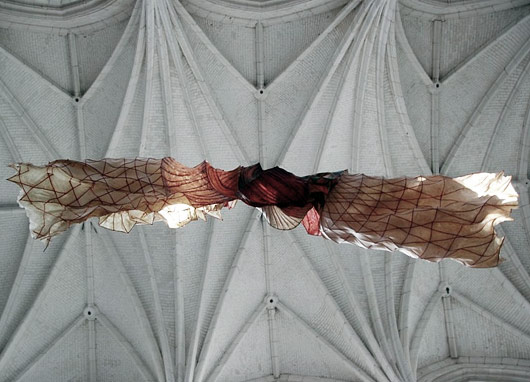 More than 100 of Peter Gentenaar‘s ethereal paper sculptures were hung inside the Abbey church of Saint-Riquier in France.