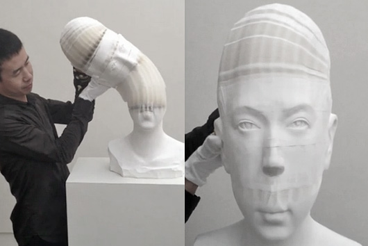 This video by Dominik Mersch Gallery in Sydney shows the brilliance that is Li Hongbo’s paper forms. What appear to be solid plaster sculptures are actually layers of paper that have been glued together to form accordion-like forms with astounding expanding capability.