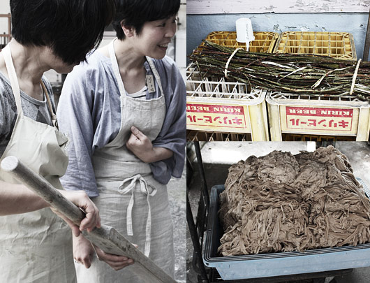 Beating fibres down with a wooden mallet or as Kamo and Chiaki present below (to our Aussie sporting delight), a cricket bat.