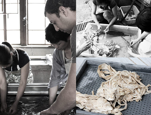 After soaking the dried kozo (shown on crates above) we scraped off the outer bark.